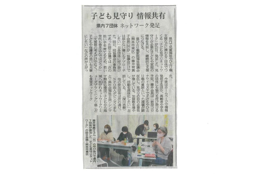 2021年1月23日、「熊本子どもみまもりネットワーク」発足にむけての会議を行い。その取り組みが熊本日日新聞社に紹介されました。